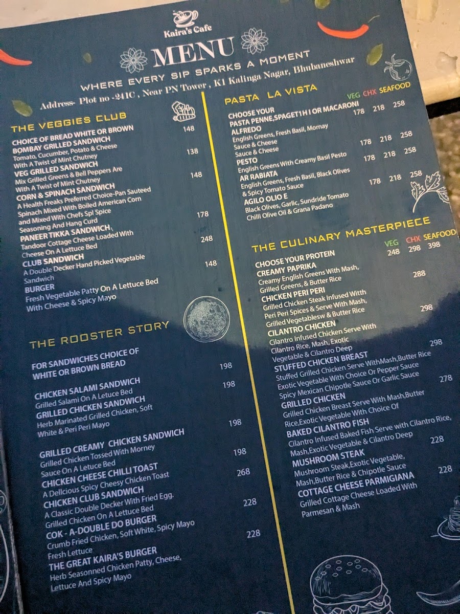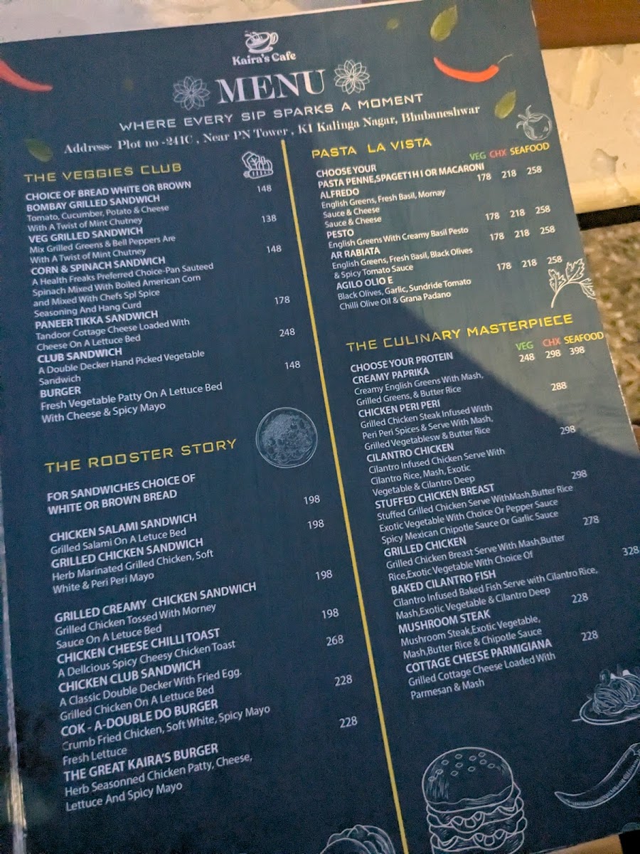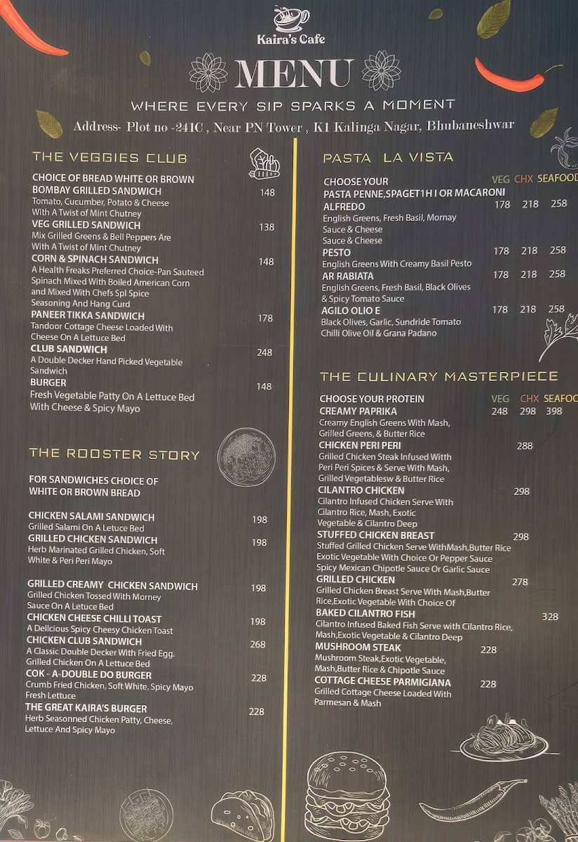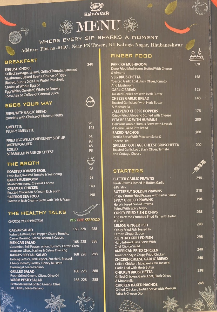 Welcome to Kaira's Cafe, a charming spot situated in the heart of Bhubaneswar, near PN Tower. This cozy eatery not only offers a delightful ambiance but also showcases an enticing menu that caters to various palates.